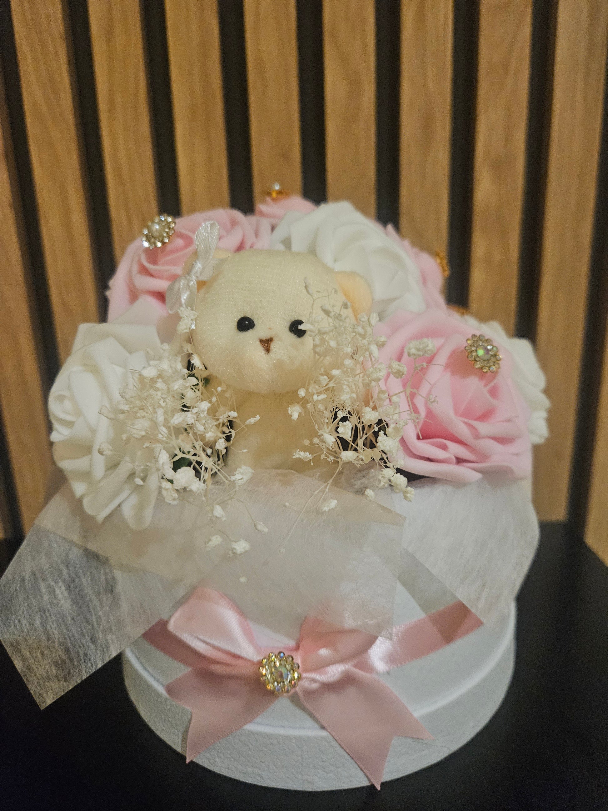 Elle est composée de fleurs artificielles délicatement ornées de strass, d’un nœud en satin raffiné, et accompagnée d’un adorable petit ourson pour une touche de tendresse.
